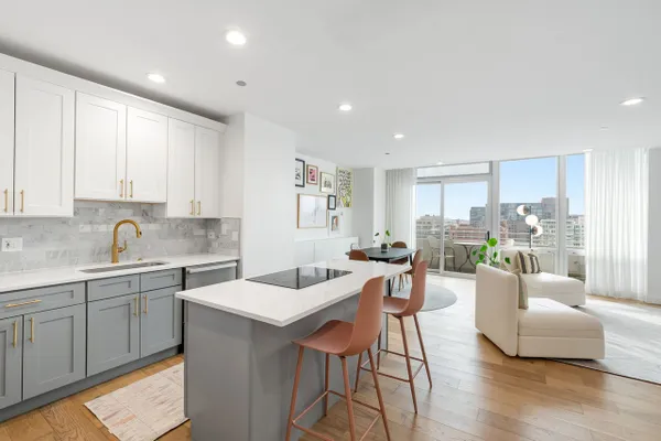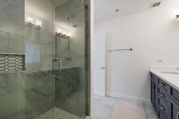 PERFECTION IN HOT WEST LOOP - SKYBRIDGE! Completely renovated from top to bottom a few years ago, this stunning 2-bedroom, 2-bath residence offers sophisticated city living with spectacular west-facing sunset views. The beautiful kitchen and baths showcase high-end finishes and thoughtful design throughout. Gorgeous hardwood floors flow seamlessly through the living and dining areas, highlighted by floor-to-ceiling windows and custom window treatments that flood the home with natural light. Step out onto the 19' x 5' private balcony and enjoy city views. The gorgeous kitchen features stainless steel appliances, including a Miele dishwasher, a stylish Newport Brass faucet, marble backsplash, and sleek quartz countertops. The spacious primary suite offers two closets, including a generous walk-in with custom organizers. Stunning primary bath is finished in marble and includes a double vanity with quartz countertops, Grohe plumbing fixtures, and a Toto toilet. The second bath is equally refined with marble tile and Grohe fixtures. Additional highlights include a laundry room with newer side-by-side LG front-loading washer and dryer, extra storage, and deeded heated garage parking available for an additional $25,000. Skybridge is a full-amenity building offering 24-hour door staff, a fitness center, sundeck with skyline views, dog run, dry cleaners, on-site management, and direct access to Whole Foods. Unbeatable West Loop location just steps to the highway, "L," Metra, Mariano's, Bartelme Park, Randolph Street's Restaurant Row, and the Loop.